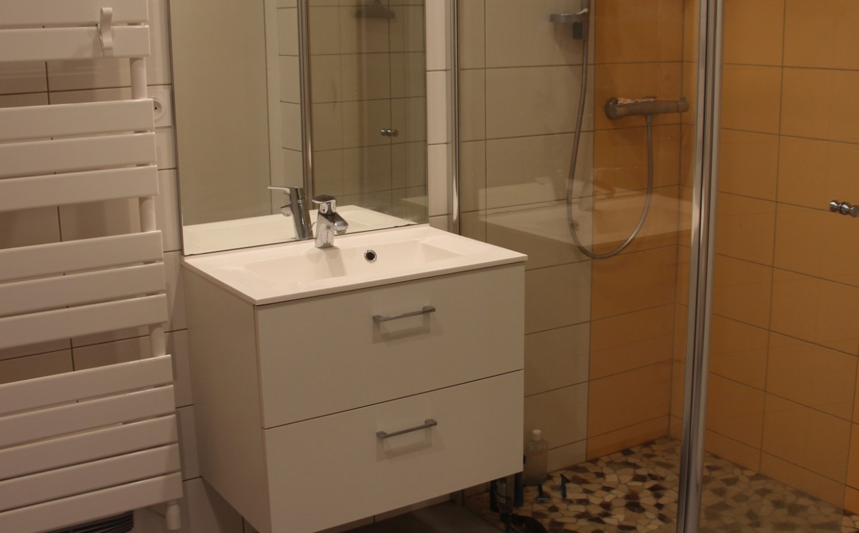 Au rez-de-chaussée d'un immeuble de 5 logements, l'appartement comprend une entrée avec rangements, cuisine équipée ouverte sur salon-séjour, une chambre, un bureau, une salle d'eau avec WC.