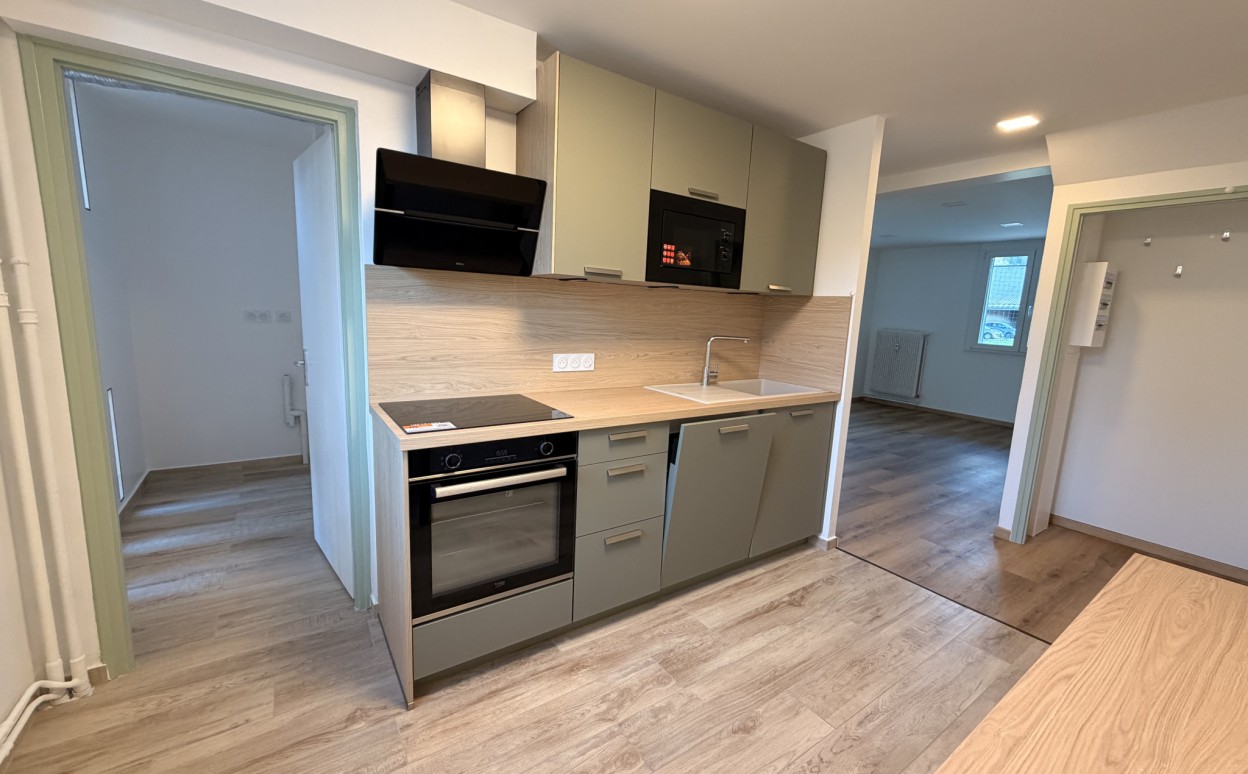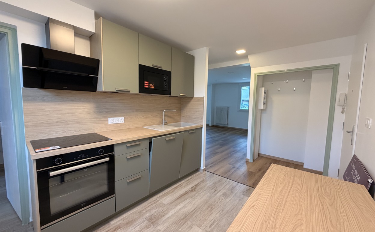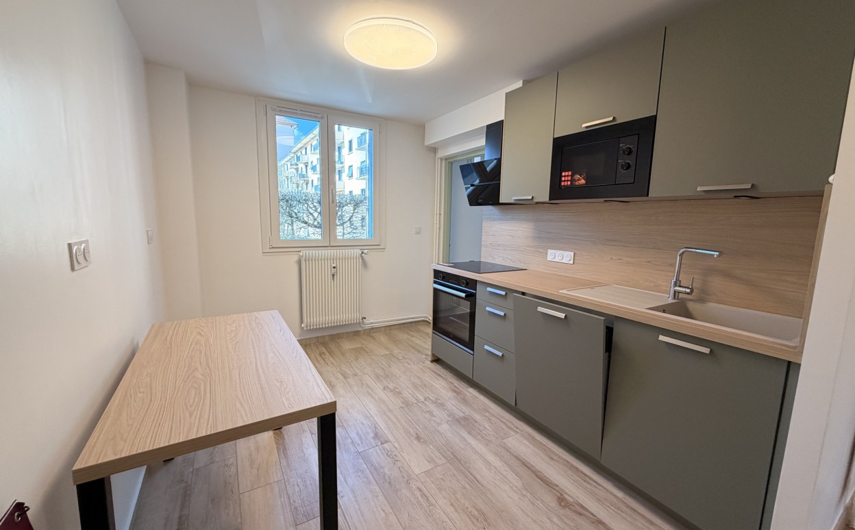 Au RDC surélevé appartement de type 5 entièrement refait à neuf comprenant une entrée avec rangements, une cuisine entièrement équipée avec cellier, grand salon/séjour, 3 chambres avec placards, salle d'eau, WC séparés, cave et garage.