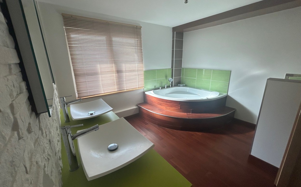 À l'étage, vous trouverez trois chambres ainsi qu'une salle de bains avec baignoire, douche et WC.