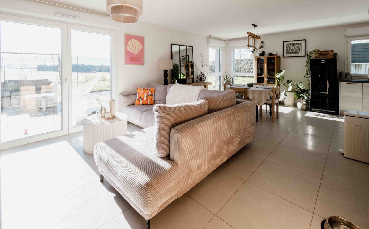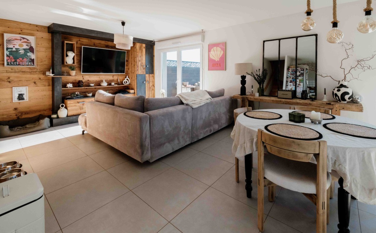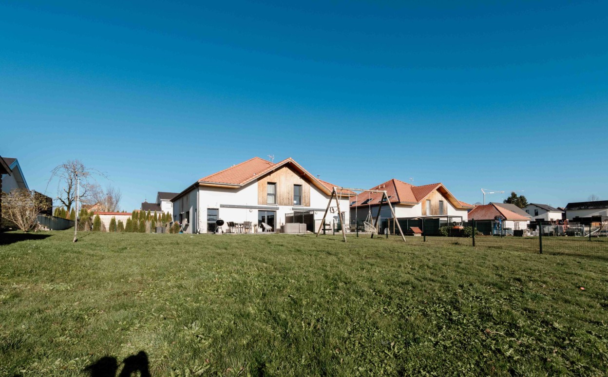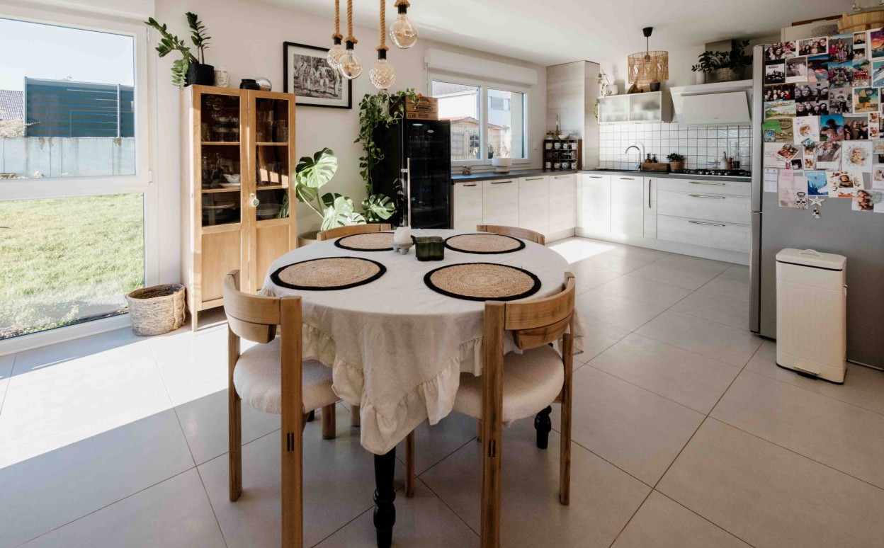 Appartement de 2018 de type 4 en duplex, comprenant entrée, buanderie, wc, grande cuisine toute équipée ouverte sur salon-séjour, avec accès sur une grande terrasse et jardin. A l'étage salle de bain, 3 chambres et WC.