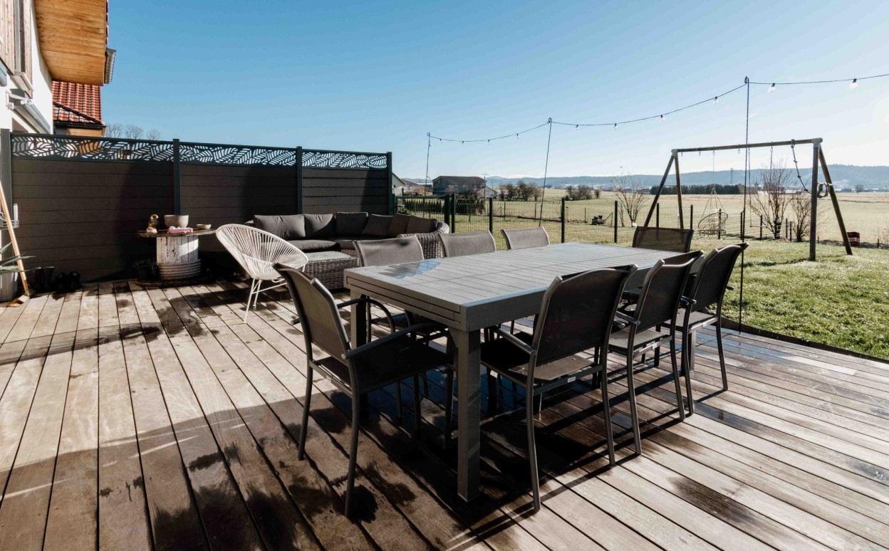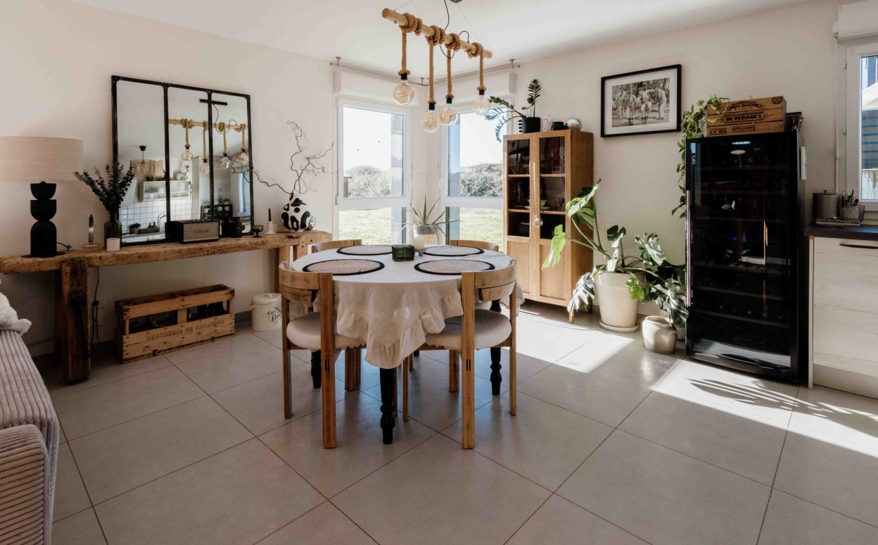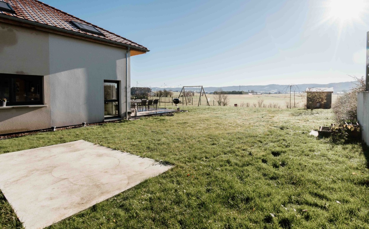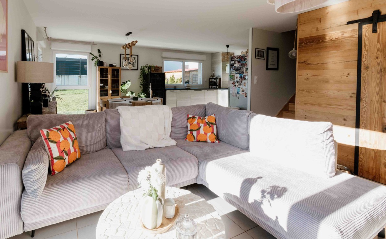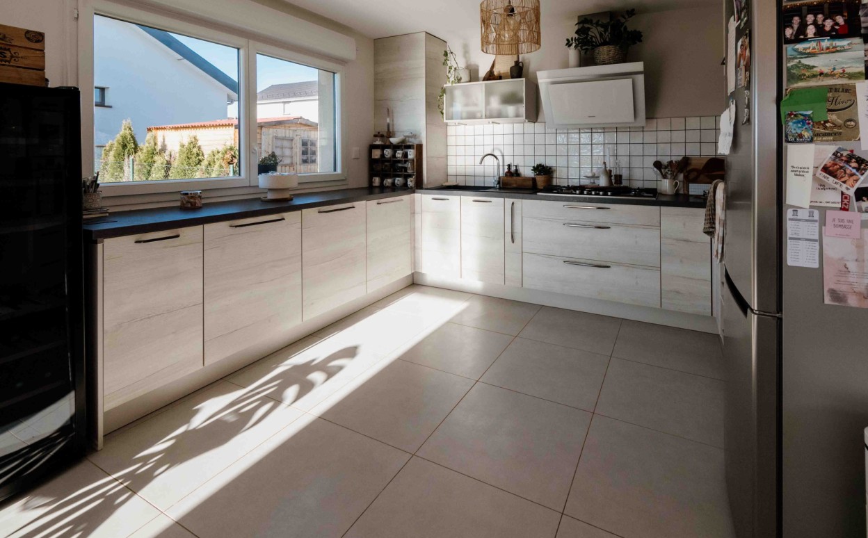 Appartement de 2018 de type 4 en duplex, comprenant entrée, buanderie, wc, grande cuisine toute équipée ouverte sur salon-séjour, avec accès sur une grande terrasse et jardin. A l'étage salle de bain, 3 chambres et WC.