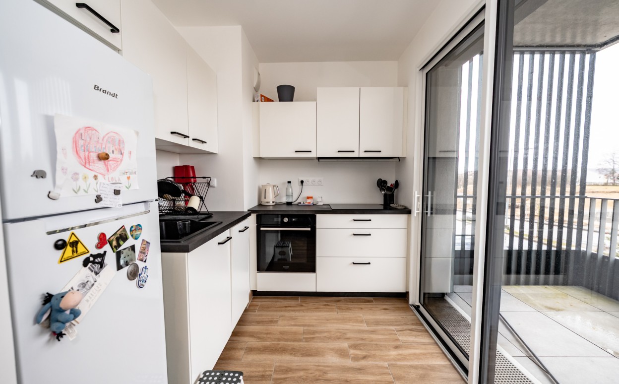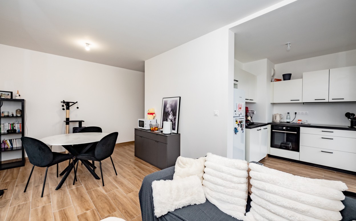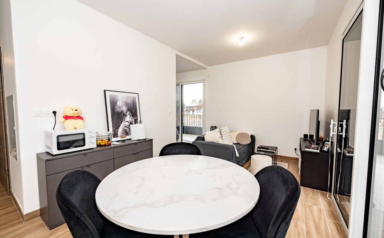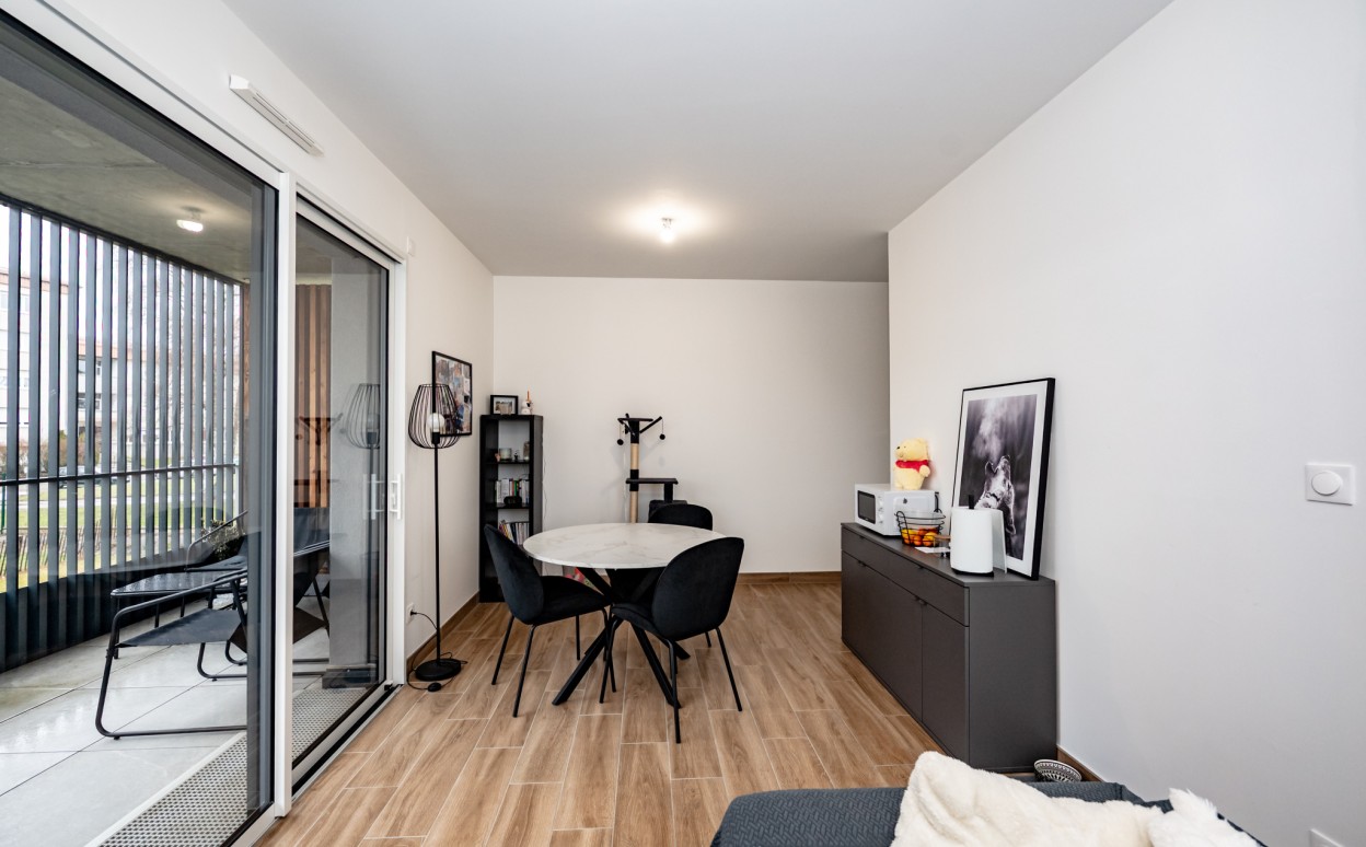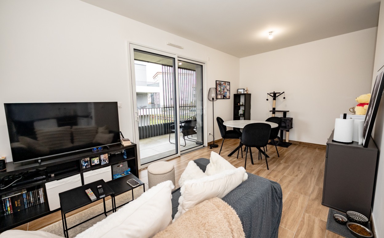 Appartement dans une résidence de haut standing comprenant : un séjour/cuisine avec accès à la terrasse, deux chambres, une salle d'eau et des WC séparés.