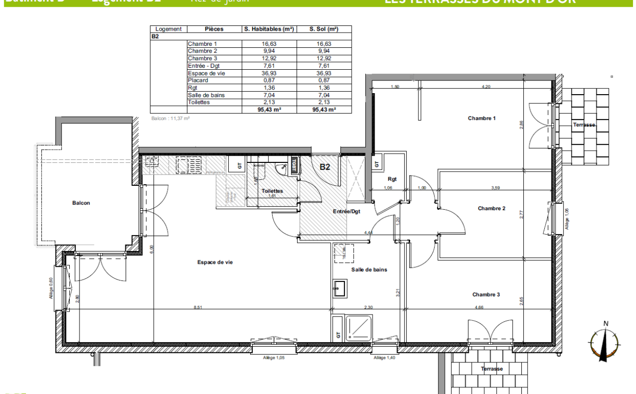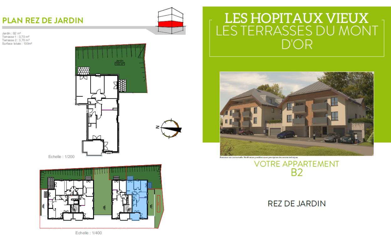 LES HOPITAUX VIEUX : Les Terrasses du Mont d'Or, appartement de type 4 neuf de 95.43 m2 comprenant un bel espace de vie avec cuisine , trois chambres, une salle d'eau avec WC. Trois terrasses et un jardin de 100 m2 complètent le bien.