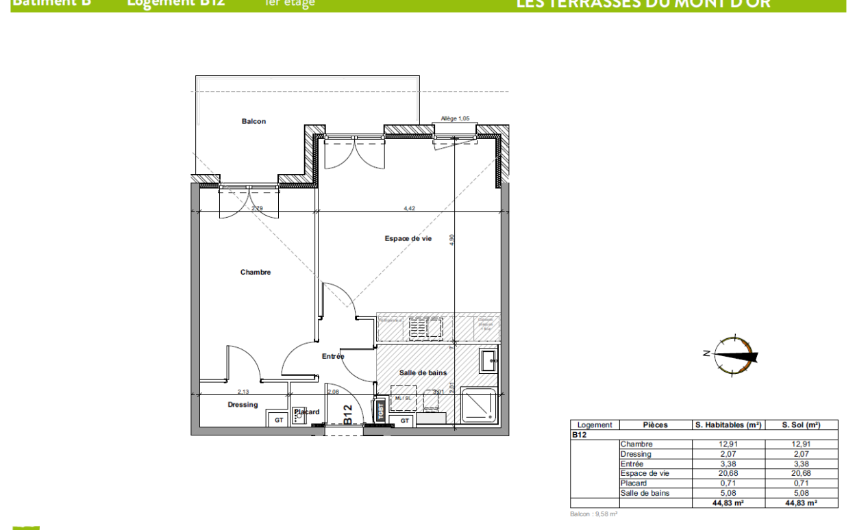 LES HOPITAUX VIEUX : Les Terrasses du Mont d'Or, appartement de type 2 neuf de 44.83 m2 comprenant espace de vie avec cuisine donnant sur une terrasse , une chambre, une salle d'eau avec WC.