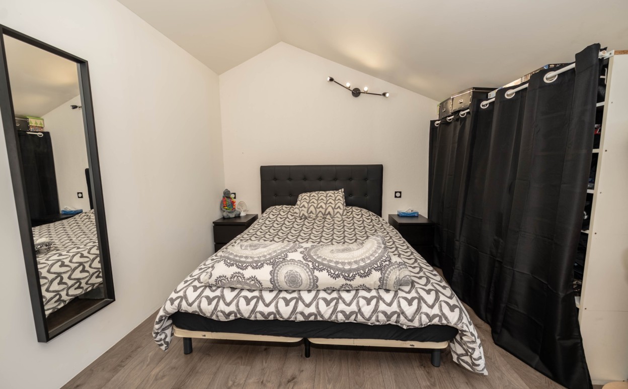 Le rez-de-chaussée offre une pièce de vie lumineuse avec cuisine ouverte sur salon-séjour, ainsi qu'une salle de bain avec WC. À l'étage, vous trouverez deux chambres.