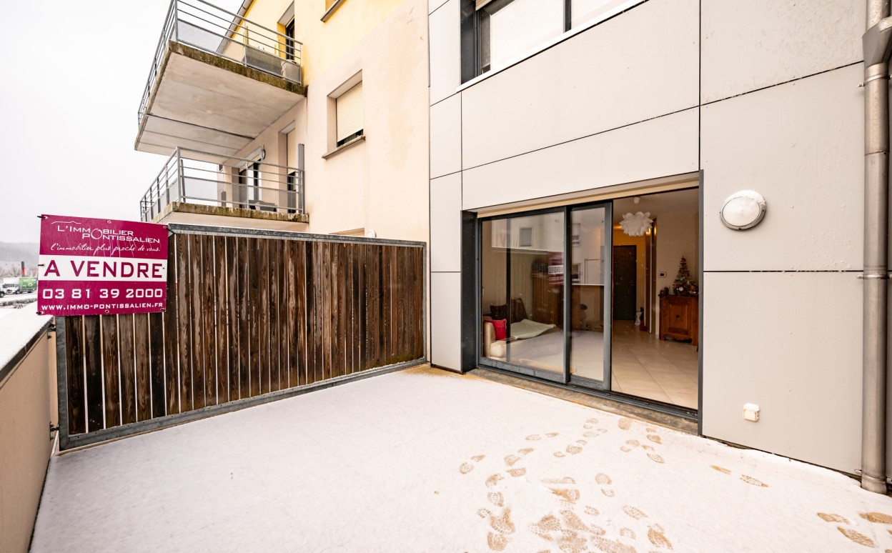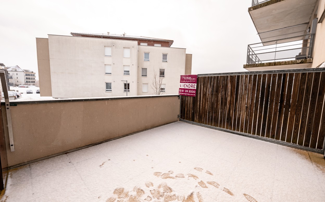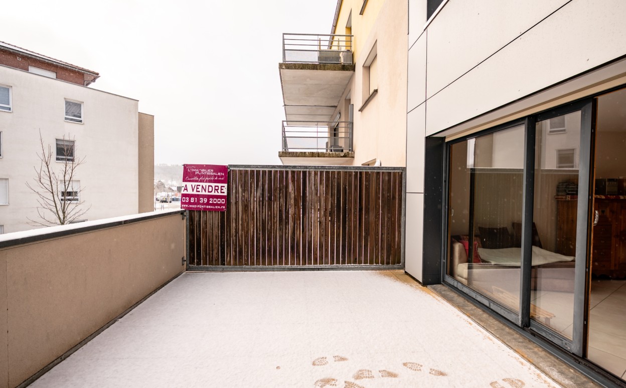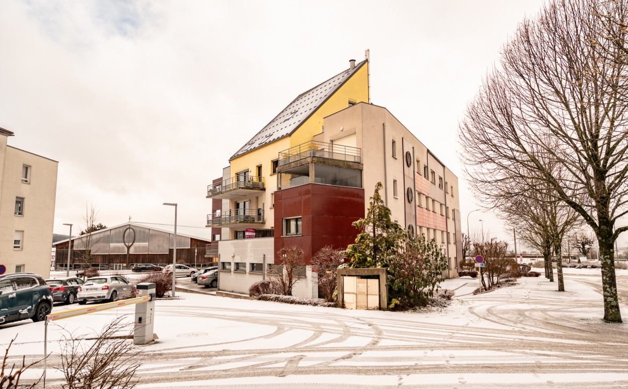 PONTARLIER - LES EPINETTES : Résidence EDEN PARC, appartement haut standing de type 2 dans une petite copropriété calme de 2009 avec ascenseur comprenant entrée avec placard, cuisine ouverte sur séjour avec accès terrasse de 17m2, chambre, salle d'eau - WC, cave et parking privé en sous-sol. Chauffage collectif avec PREVAL, VMC doube flux, DPE en C.