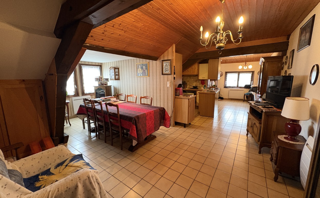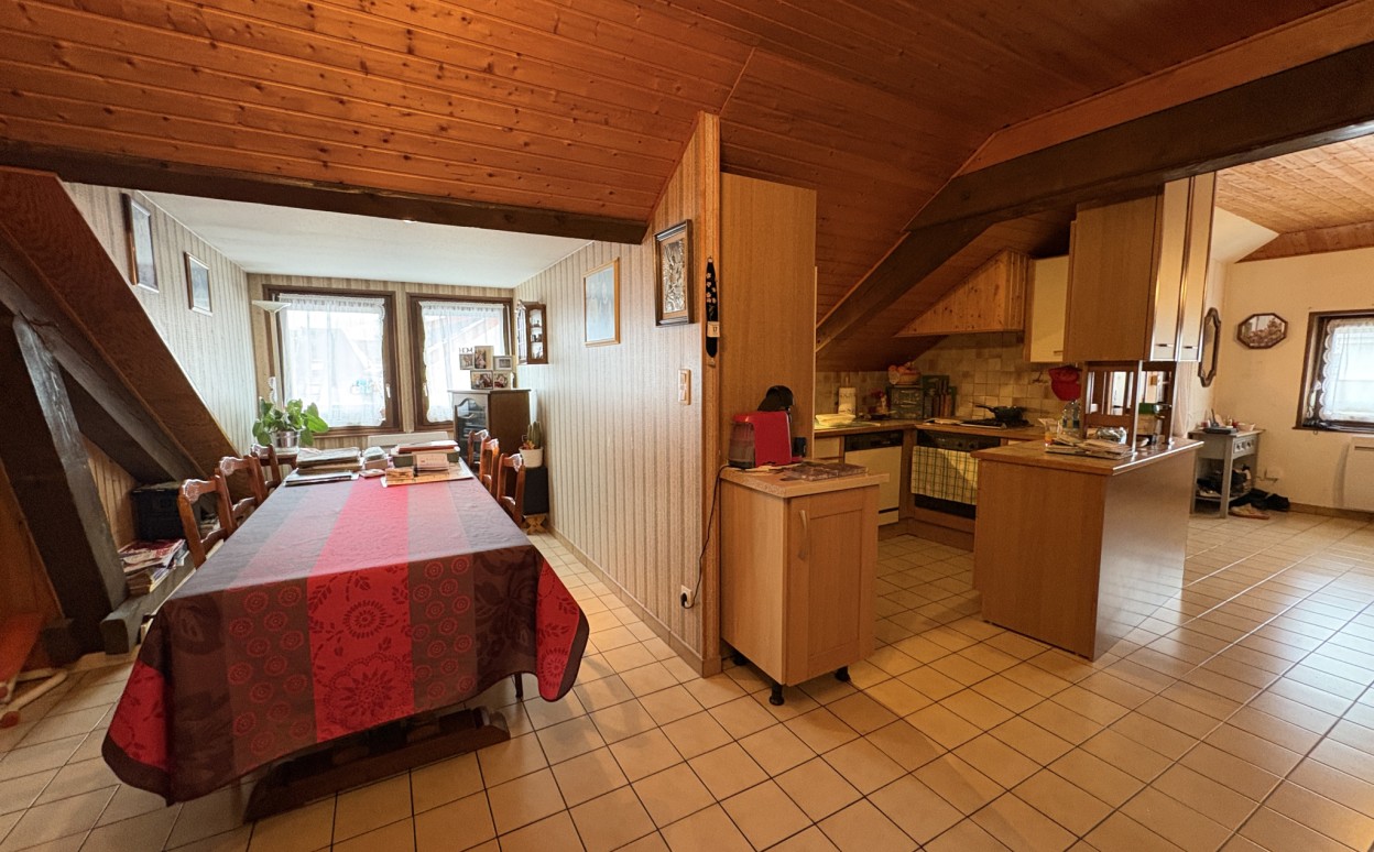 PONTARLIER - CENTRE VILLE : Appartement de type 4 de carctère à rafraichir dans une petite copropriété calme comprenant : entrée, cellier, cuisine ouverte sur séjour, salle de bains, WC, 3 chambres, cave et garage.