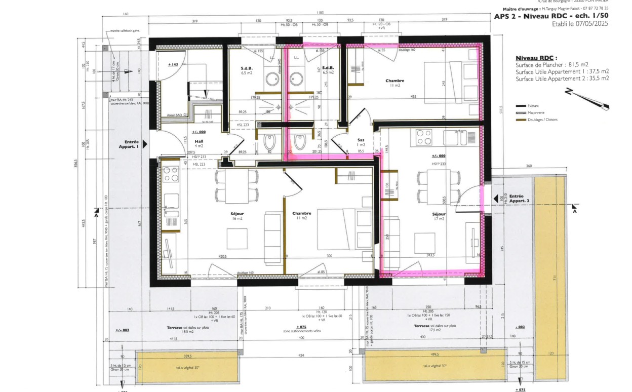 PONTARLIER : T2 comprenant une entrée indépendante, cuisine équipée ouverte sur séjour donnant sur une grande terrasse, chambre, WC, sale de bain; place de parking privative, norme RT 2020. Très bien exposé, et à proximité des écoles.