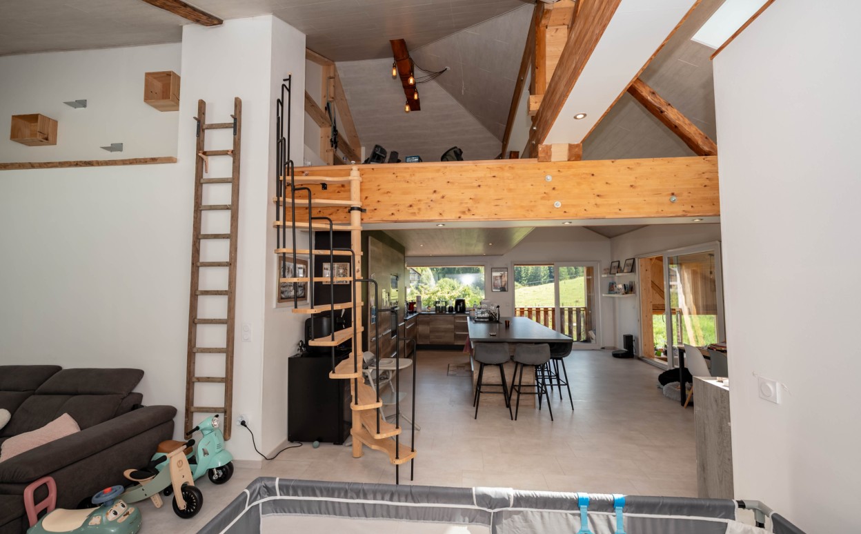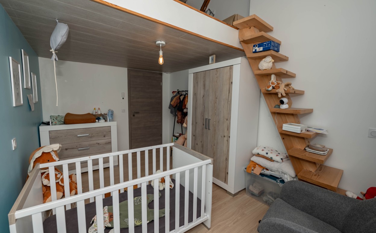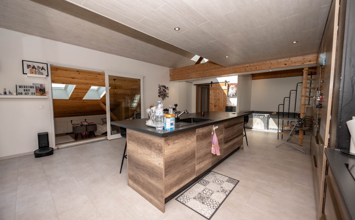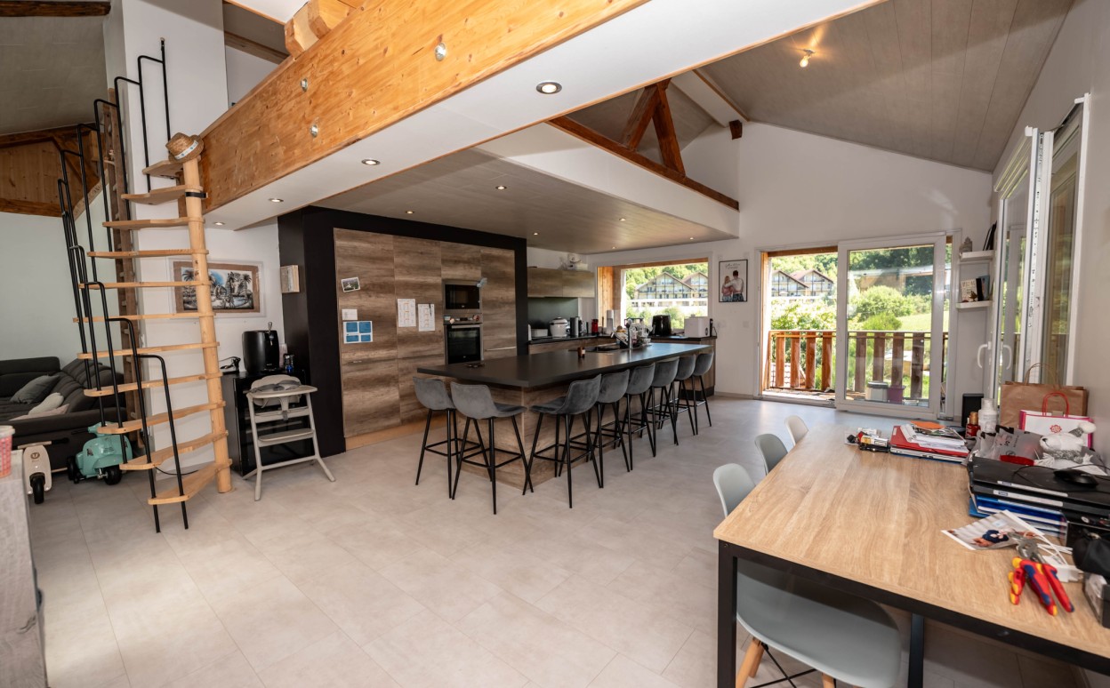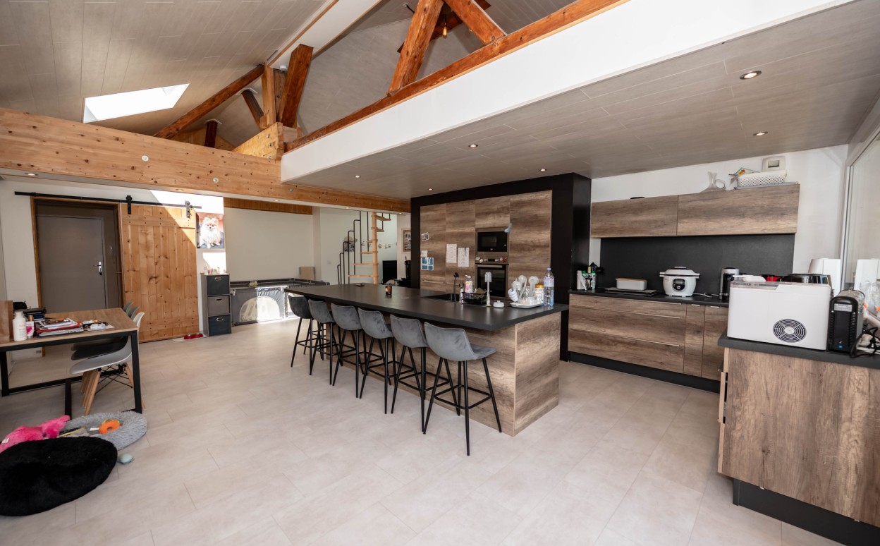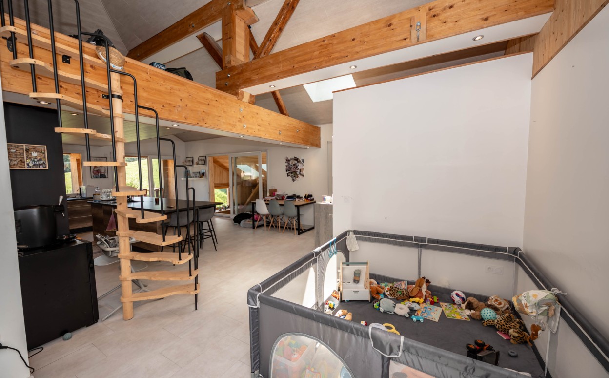 Il est composé d'une cuisine équipée ouverte sur séjour - salon, pièce très lumineuse offrant une hauteur sous plafond importante, accès balcon avec une très belle vue, mezzanine, une suite parentale avec salle d' eau, 2 chambres avec mezzanine, une salle de bain, wc, cellier, une petite salle de sport, une salle de loisirs, buanderie, 2 places de parking privatives (avec possibilité de construire un garage).