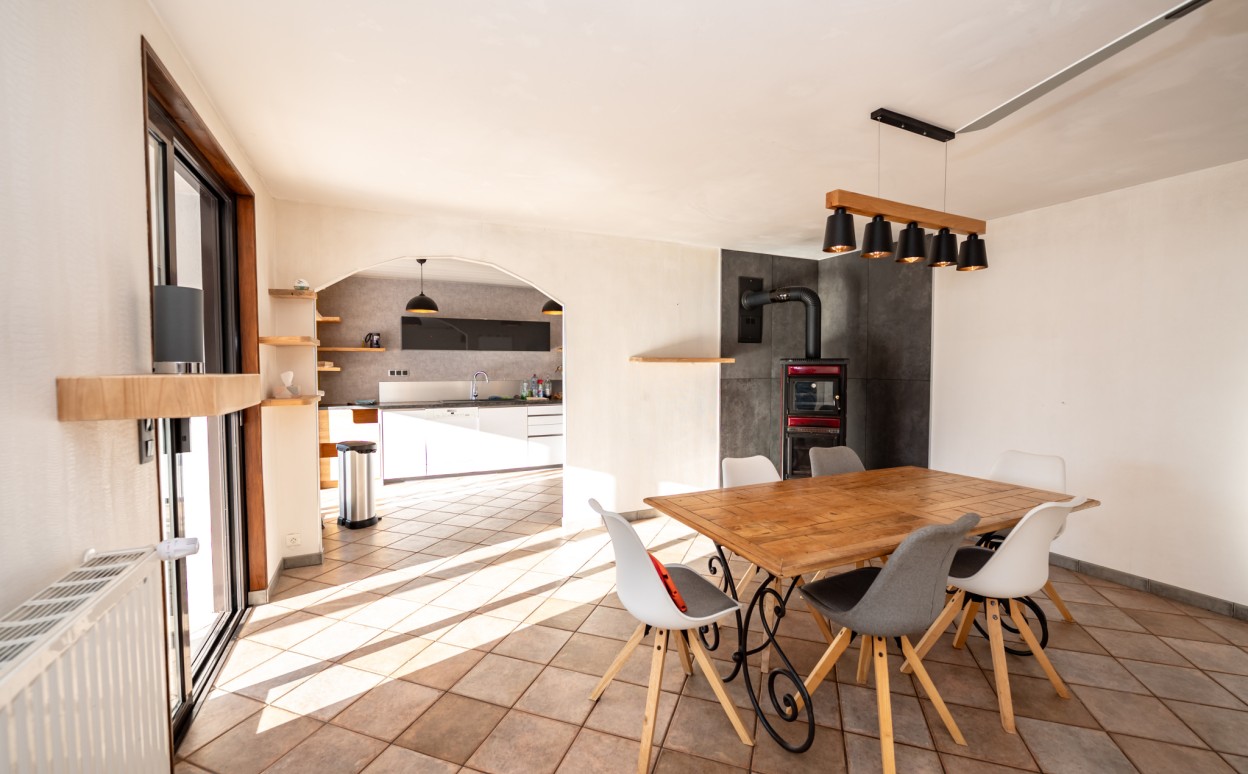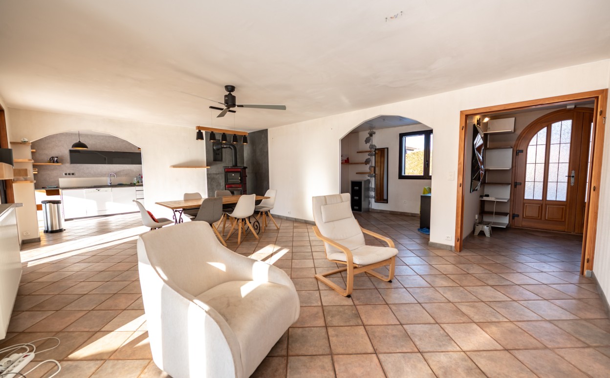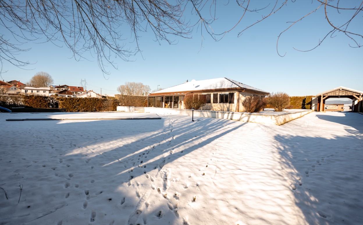 10 Km de PONTARLIER - VAL D'USIERS - SOMBACOUR : Maison de plain pied de 150m2 coprenant entrée, cuisine ouverte sur vaste séjour avec accès sur véranda de 27 m2 avec baie vitrée à galandage, bureau, buanderie, cellier, 3 chambres, salle d'eau, wc, garage. Sur une parcelle clos et arborée de 1573m2 avec une piscine de 4 x 8m. DPE en D.