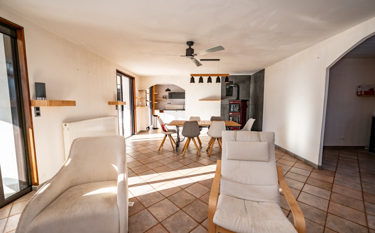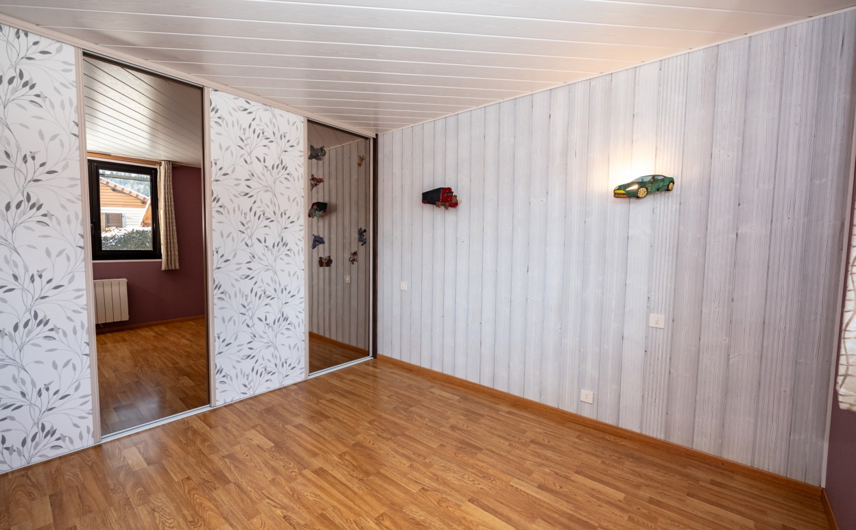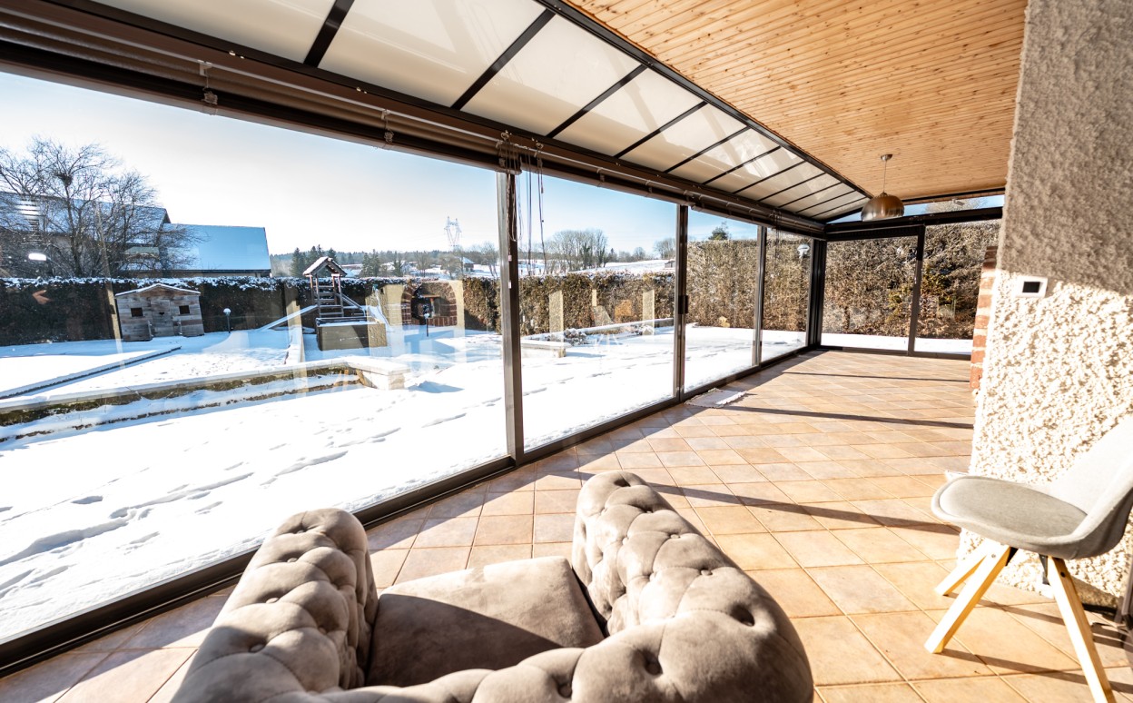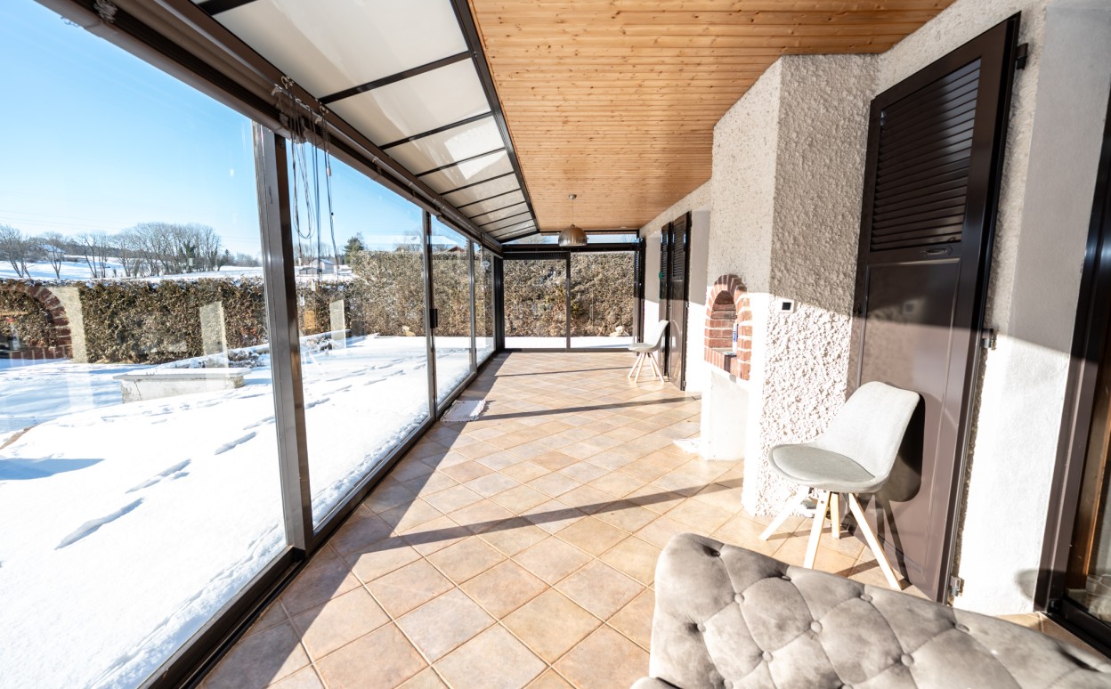 10 Km de PONTARLIER - VAL D'USIERS - SOMBACOUR : Maison de plain pied de 150m2 coprenant entrée, cuisine ouverte sur vaste séjour avec accès sur véranda de 27 m2 avec baie vitrée à galandage, bureau, buanderie, cellier, 3 chambres, salle d'eau, wc, garage. Sur une parcelle clos et arborée de 1573m2 avec une piscine de 4 x 8m. DPE en D.