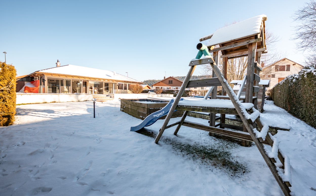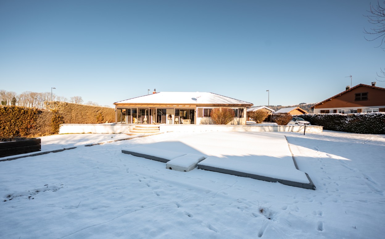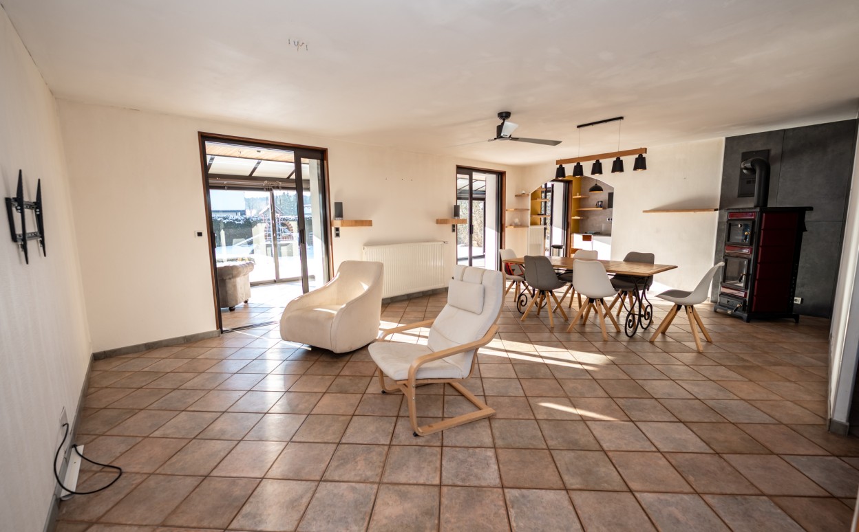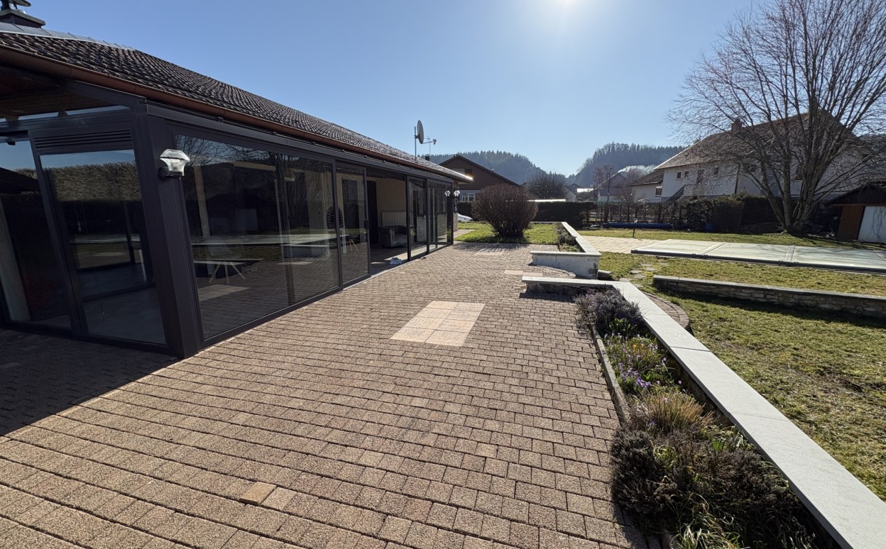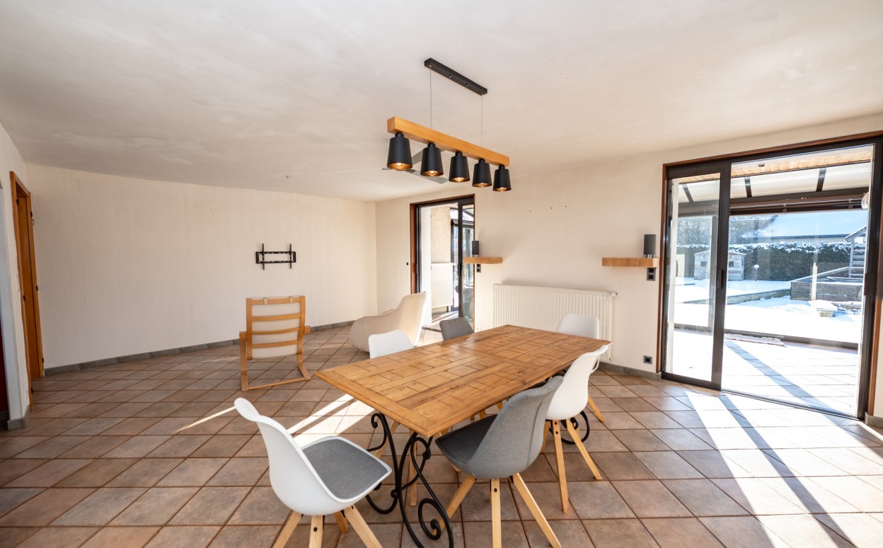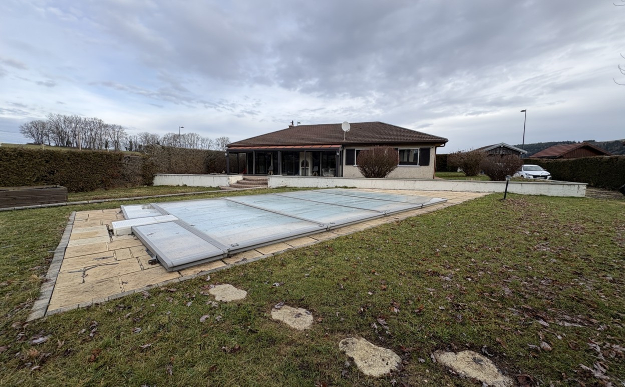 10 Km de PONTARLIER - VAL D'USIERS - SOMBACOUR : Maison de plain pied de 150m2 coprenant entrée, cuisine ouverte sur vaste séjour avec accès sur véranda de 27 m2 avec baie vitrée à galandage, bureau, buanderie, cellier, 3 chambres, salle d'eau, wc, garage. Sur une parcelle clos et arborée de 1573m2 avec une piscine de 4 x 8m. DPE en D.